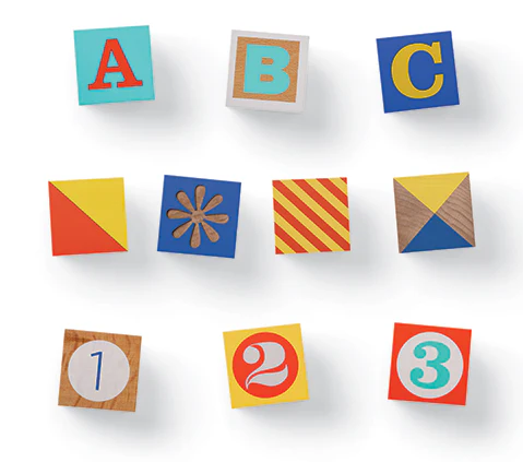 These 10 solid beech wood blocks feature all the letters A through Z, numbers 1 through 10, plus a fun variety of colorful shapes, patterns, and dots to count.