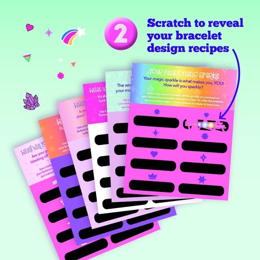 Discover your future one fold at a time! Craft-tastic Fortune Bracelets combines the nostalgic fun of paper fortune tellers with the creativity of bracelet making for a uniquely satisfying craft experience. Find the symbol at the center of each fortune teller, scratch off the matching card to reveal your destiny, and then craft the bracelet that goes with it. A playful and imaginative activity for kids who love surprises and handmade jewelry.