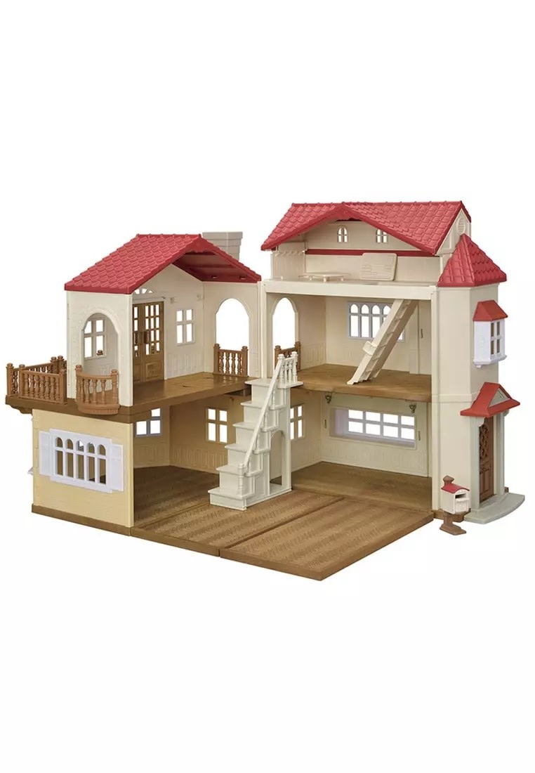 *Red Roof Country Home -Secret Attic Playroom- features a large house that can be opened up for play. Includes a lamp that lights up.