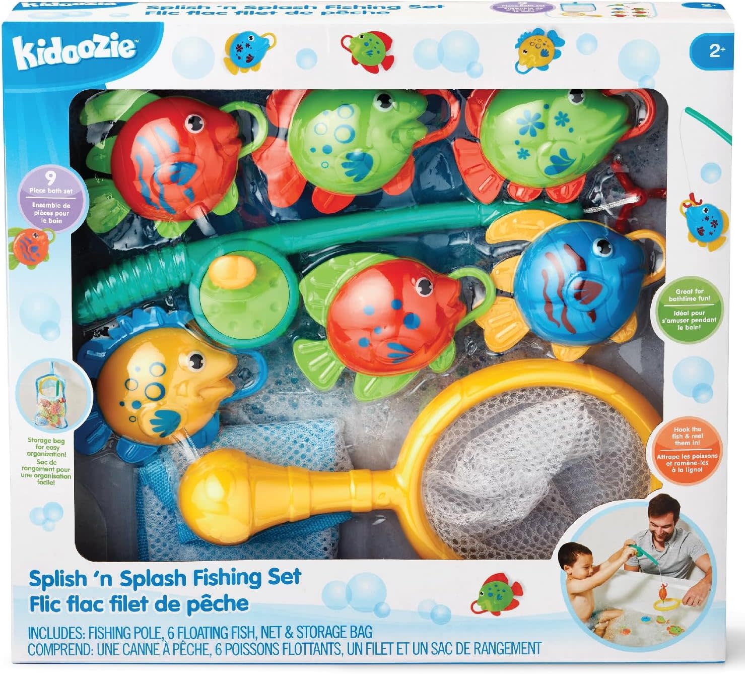 SPIN 'N PLAY: It's time to cast your pole and catch some fish with the Kidoozie Splish 'n Splash Fishing set. Use the fishing pole to hook one of the six floating fish and then reel them in! Otherwise use the net to scoop them up as they float around in the bath.